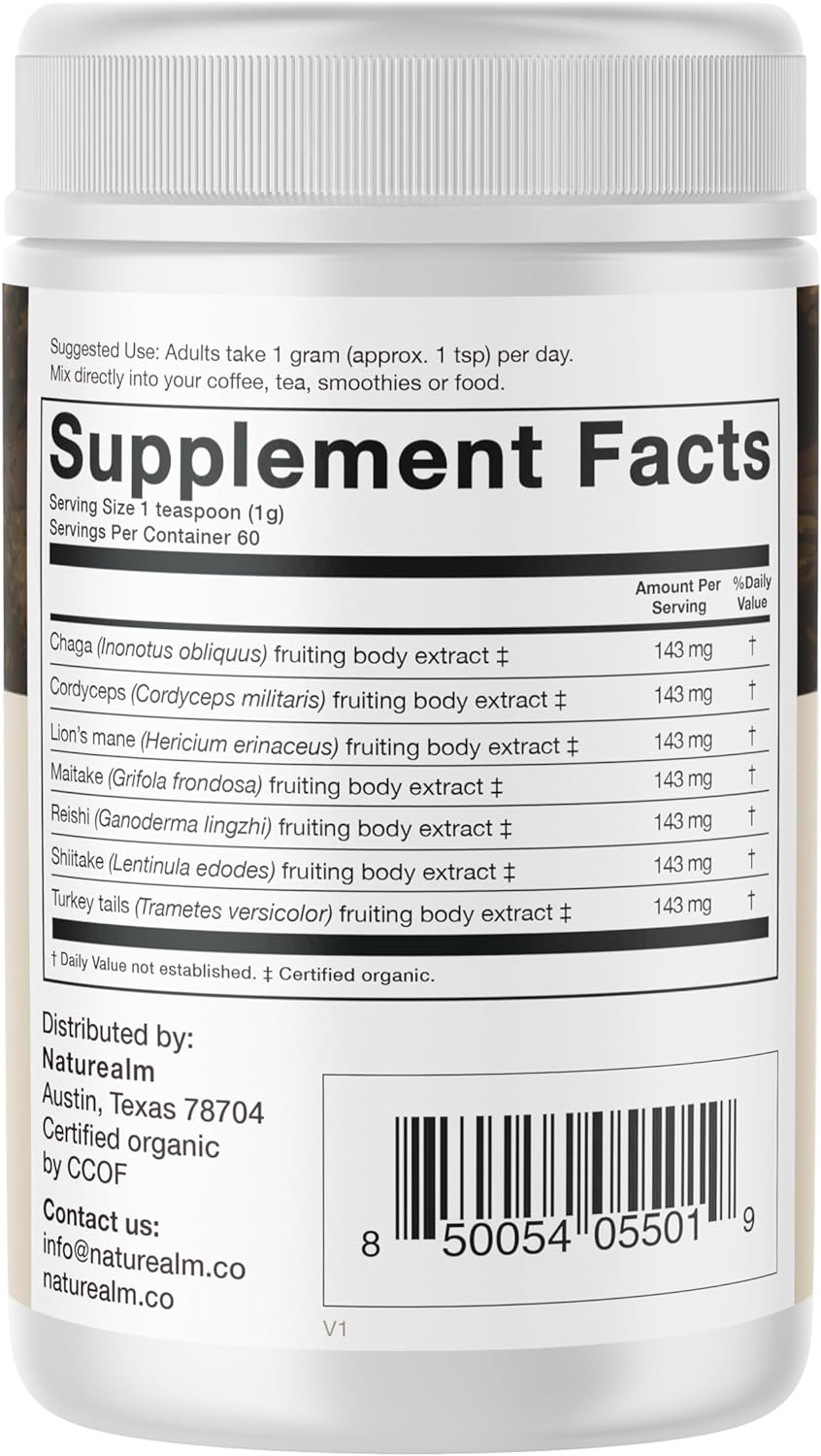Know what you’re getting. Look for mentions of “whole fruiting bodies” and “beta-glucan content.” The mushrooms in Naturealm Sacred 7 are guaranteed to have at least 20% beta-glucans.